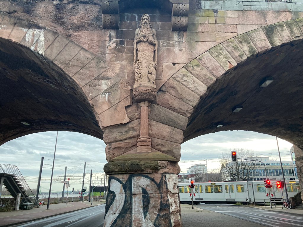 Besonders ist vor allem, dass Teile der ursprünglichen Architektur erhalten sind. Zwar wurde die Brücke 1945 beschädigt, aber weniger dramatisch als viele andere Rheinbrücken. Die Bogenkonstruktion und die historistische Bauweise vom Anfang des 20. Jahrhunderts sind für uns heute noch sichtbar. Besonders sind übrigens auch die Eigentumsverhältnisse: Die Brücke selbst gehört der Deutschen Bahn, aber die Stadt Köln unterhält und pflegt die Gehwege. Und das übrigens schon seit 1910!