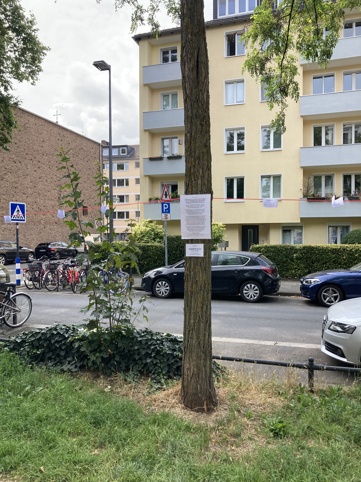 Als ich Ende Juli durch die Volksgartenstraße in der Südstadt geradelt bin, sah der begrünte Mittelstreifen anders aus als sonst. Zwischen der Lutherkirche und der Vorgebirgstraße waren die Bäume mit roten Wäscheleinen verbunden, an denen Zettel im Wind flatterten. An den Bäumen selbst waren größere Blätter mit Fotos und Texten angebracht.